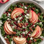 A vibrant and flavorful Autumn Harvest Honeycrisp Apple and Feta Salad featuring toasted pecans and pumpkin seeds, crispy prosciutto, fresh arugula, juicy apples, creamy avocado, pomegranate arils, and tangy feta cheese, all tossed in a homemade apple vinaigrette with a hint of fresh herbs.