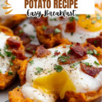 A hearty and delicious Breakfast Sweet Potato recipe featuring baked sweet potatoes filled with a savory blend of bacon, cheddar cheese, and eggs, topped with fresh scallions for a satisfying morning meal.