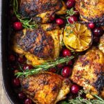 A flavorful baked cranberry chicken recipe infused with fresh rosemary, garlic, and a tangy blend of brown sugar and white wine vinegar. Perfectly seared chicken pieces are baked with sugared cranberries, celery, onions, and lemon juice, creating a deliciously juicy and aromatic main course.