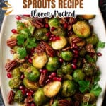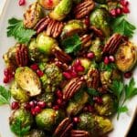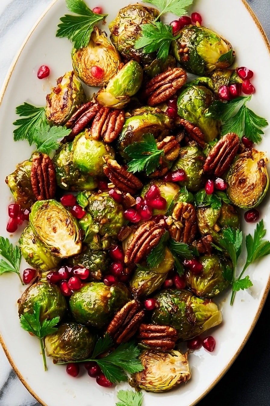 - Add Nuts and Fruit: Transfer the roasted Brussels sprouts to a serving dish. Gently toss them with toasted pecan halves and dried cranberries or pomegranate arils to add texture and sweetness.
