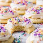 Delightfully soft and tender birthday cake cookies with a creamy cream cheese frosting and festive confetti crumbs, perfect for celebrations or an everyday treat.
