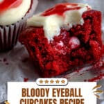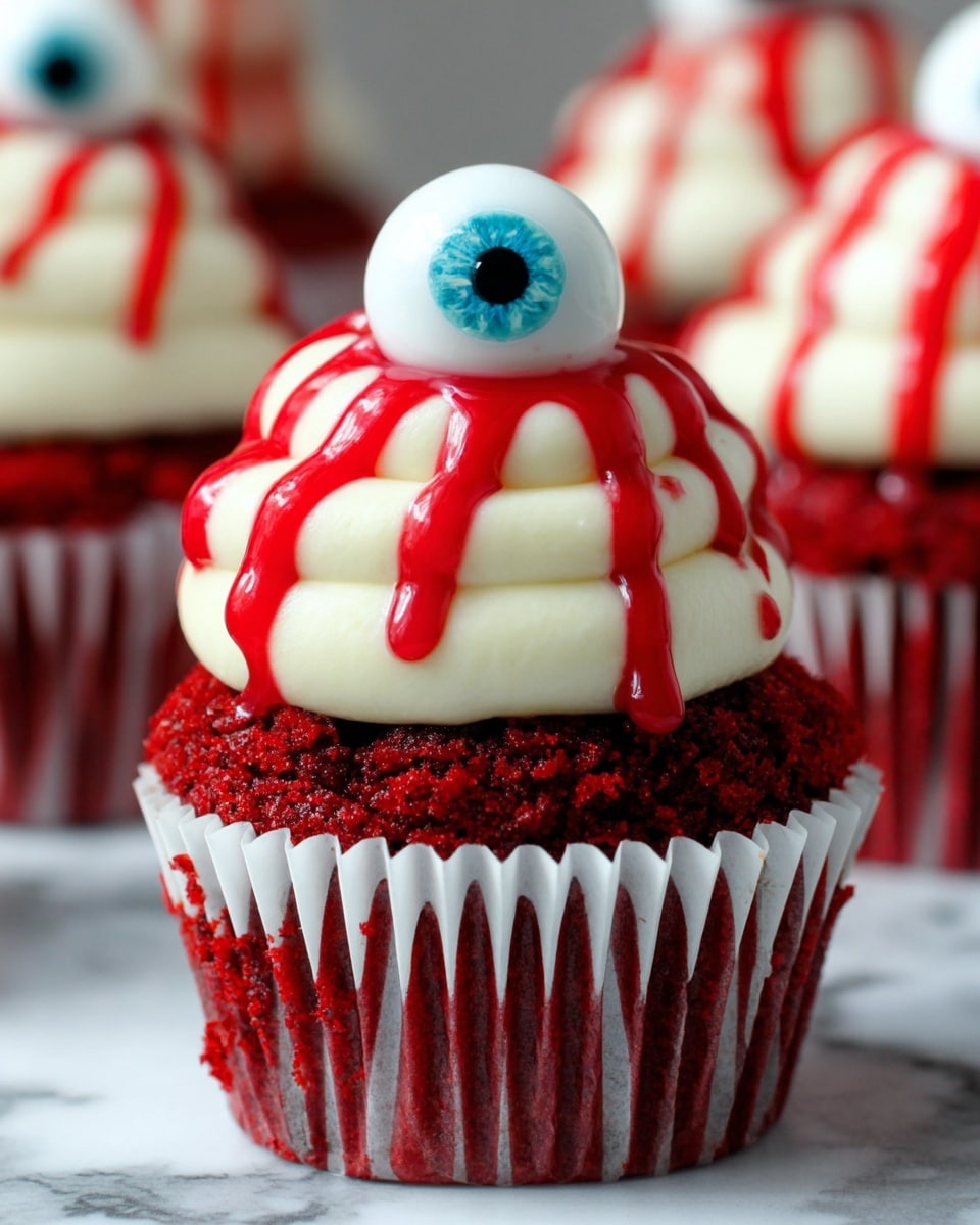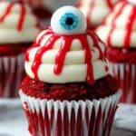 Bloody Eyeball Cupcakes are a spooky and fun dessert perfect for Halloween or themed parties. These red velvet cupcakes are filled with cherry pie filling for a ‘bloody’ surprise, topped with creamy cheesecake frosting and finished with creepy eyeball candies for a dramatic effect.