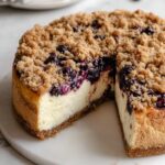 This Blueberry Crumble Cheesecake features a buttery cookie crust, a creamy cheesecake filling, fresh blueberries, and a crunchy crumble topping. Baked in a water bath for a perfect texture, it’s a delightful dessert perfect for any occasion.