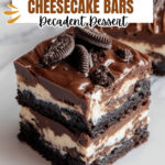 Delicious Brownie Cheesecake Bars featuring a rich brownie base layered with creamy cheesecake, topped with a smooth chocolate ganache and crunchy Oreo pieces. A perfect dessert to satisfy chocolate lovers and cheesecake fans alike.