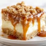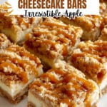 Deliciously creamy caramel apple cheesecake bars featuring a buttery crust, rich cheesecake filling, cinnamon-spiced apples, and a crumbly streusel topping, finished with a luscious caramel drizzle. Perfect for dessert fans looking for a comforting fall treat.