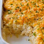 A creamy and cheesy hashbrown casserole made with thawed frozen hashbrowns, melted butter, cream of chicken soup, sour cream, chopped onion, and shredded cheddar cheese. This comforting dish bakes to a golden brown and bubbling finish, perfect for family gatherings or potlucks.