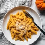 I recommend using pastas like penne, rigatoni, or even fusilli — these shapes have little ridges or tubes that trap the creamy chipotle pumpkin sauce perfectly. But really, use whatever you have on hand!