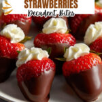 Delicious Chocolate Covered Cheesecake Strawberries feature fresh strawberries dipped in melted semi-sweet chocolate and filled with a creamy, fluffy cheesecake filling. Perfect as a fancy dessert or a sweet snack, these treats combine the burst of juicy fruit with rich decadent flavors.