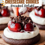 Decadent Chocolate Cherry Cheesecake Cookies featuring a rich chocolate cookie base topped with creamy cheesecake frosting and luscious cherry pie filling for a delightful treat perfect for any occasion.