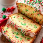A festive and colorful Christmas Bread featuring a moist vanilla loaf studded with vibrant holiday sprinkles and topped with a sweet vanilla glaze, perfect for holiday celebrations and gifting.