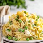 - Tender Chicken & Peas: Shredded cooked chicken and peas add savory, fresh bites that balance the richness.