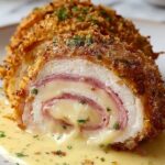Crispy Creamy Chicken Cordon Bleu is a delicious twist on the classic French dish featuring tender chicken breasts layered with Swiss cheese and ham, breaded and fried to golden perfection, then served with a rich, creamy Dijon Parmesan sauce.