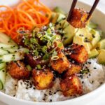 After your tofu cools a bit (about 5 minutes), transfer it to a big bowl and toss it with half the sauce. Reserve the rest for drizzling when you plate. This keeps the crispy coating crisp and lets the tofu soak up just enough saucy goodness. I usually serve mine over rice with crunchy cucumbers, sweet carrots, creamy avocado, and a sprinkle of sesame seeds for that authentic finishing touch.