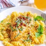 When time’s up, carefully remove the chicken breasts and whisk in the freshly grated parmesan into the sauce—this adds a lovely, nutty depth that melts into the cream perfectly. Return the chicken to the slow cooker and spoon the sauce over the top. Finish things off by stirring fresh chopped basil leaves on top; the bright herb flavor is the perfect contrast to the rich sauce. Serve immediately and get ready to swoon over the flavors!