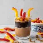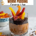 - Add Toppings and Serve: Just before serving, sprinkle the crushed gluten-free chocolate cookies over the pudding and decorate with gummy worms to create the dirt worm effect. Serve immediately and enjoy.