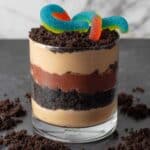 Freezing Dirt Pudding Cups isn’t my favorite because the texture of the pudding can change upon thawing, and the cookies get soggy. But if you want to try, freeze the pudding base alone and defrost in the fridge overnight before layering and adding cookies and gummies fresh.