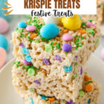 These festive Easter Rice Krispie Treats combine crispy cereal, gooey marshmallows, and colorful Easter-themed M&Ms and sprinkles for a fun and delicious holiday treat that’s easy to make and perfect for sharing.