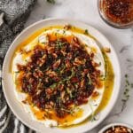 I like to soften the goat cheese ahead of time, so it’s nice and spreadable when I’m ready. Just let it sit at room temperature for about 20 minutes. Then spread it evenly on a low plate or shallow bowl and drizzle the olive oil over it—this little touch makes the cheese silkier and helps carry the flavors.