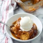 Bake at 350 degrees for 35 to 40 minutes. The top will set firmly, but the cake will jiggle a bit because of the pudding layer underneath — that’s totally normal! Let the cake rest for 5 to 10 minutes after baking to allow the sauce to thicken up before serving.
