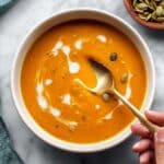 Leftover pumpkin soup stores beautifully in an airtight container in the fridge for up to 4 days. I usually cool it completely before refrigerating to keep it fresh longer. Just remember to give it a good stir before reheating because the spices settle a bit.