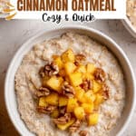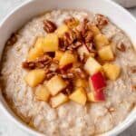 A comforting and easy-to-make vegan apple cinnamon oatmeal that features tender cooked apples with warm spices served atop creamy rolled oats simmered in almond milk and water, sweetened with maple syrup, and garnished with crunchy nuts for a wholesome breakfast.