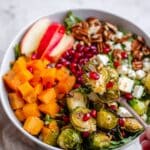 Since the salad involves fresh greens and delicate cheese, I don’t recommend freezing the fully assembled salad. However, you can freeze the roasted butternut squash and Brussels sprouts separately, then thaw and add fresh ingredients when you’re ready to serve.