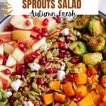 This Fall Harvest Salad features roasted butternut squash and crispy Brussels sprouts tossed with mixed greens, sweet Honeycrisp apple, crunchy pecans, pomegranate arils, pumpkin seeds, and creamy goat’s cheese. Finished with a tangy balsamic vinaigrette, this vibrant salad is perfect for a nutritious lunch or a delightful side dish during cooler months.