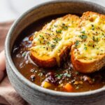 French Onion Short Ribs is a rich and comforting main course featuring tender bone-in beef short ribs simmered with caramelized onions, shallots, garlic, fresh herbs, and a savory broth enhanced with tamari and white wine. Finished with cheesy Gruyère topped toasted French bread, this dish combines classic French onion soup flavors with succulent slow-cooked meat for an indulgent, satisfying meal.