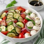A refreshing Fresh Cucumber Caprese Salad featuring diced cucumber, cherry tomatoes, fresh mozzarella, and red onion, tossed in a flavorful olive oil and balsamic vinegar marinade with herbs. Perfect for a light and vibrant appetizer or side dish.