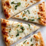 A delicious and creamy white pizza featuring a homemade garlic pizza sauce, topped with mozzarella and parmesan cheeses, Italian seasoning, and fresh basil. Perfectly baked to achieve a golden crust and melted cheese for a comforting meal.