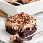 This German Chocolate Poke Cake is a rich and indulgent dessert featuring a moist chocolate cake filled with a luscious combination of sweetened condensed milk and hot fudge sauce, topped with creamy coconut pecan frosting, chopped pecans, and mini chocolate chips for added texture and flavor.
