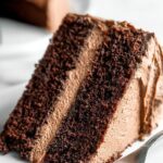 A moist and rich gluten free vegan chocolate cake made with a blend of gluten free flours, cocoa powder, and applesauce for moisture. This cake is perfect for those with dietary restrictions and is frosted with a creamy vegan chocolate frosting for a delicious finish.