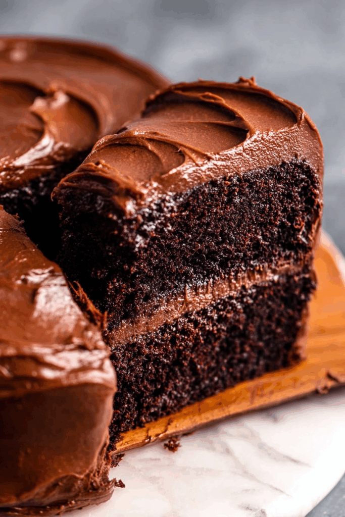 Once completely cooled, spread your favorite vegan chocolate frosting generously over the layers. I like using an icing spatula or even a butter knife if you don’t have fancy tools. Slice, serve, and savor each bite!