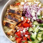 This Greek Chicken Bowl recipe features tender grilled chicken breasts marinated in a zesty lemon and herb dressing, served over fluffy quinoa with fresh cucumbers, tomatoes, red onions, feta cheese, and kalamata olives. A vibrant, healthy bowl that’s perfect for a nutritious lunch or dinner.