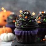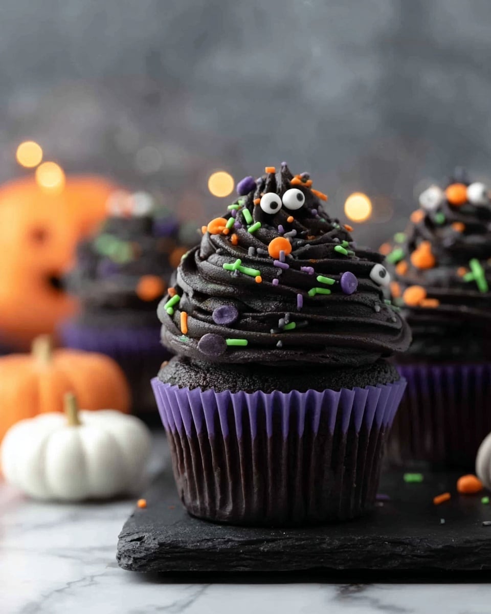 - Frost and Decorate: Frost the cooled cupcakes generously with the black Swiss meringue buttercream. Decorate with monster sprinkles and edible eyes to create a spooky monster effect.