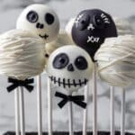 Delight your Halloween party guests with these festive Halloween Cake Pops featuring red velvet cake, cream cheese frosting, and fun spooky decorations like mummy bandages, ghosts, and Jack Skellington faces. Easy to make and perfect for a festive treat!