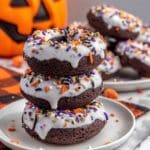 Delicious Halloween-themed chocolate donuts featuring a moist cocoa batter topped with a sweet glaze and festive sprinkles. Perfect for a spooky celebration or a fun treat for any occasion.