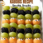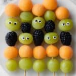 A fun and festive Halloween-themed fruit kabob recipe featuring cantaloupe, blackberries, green grapes, and spooky candy eyeballs, perfect for a healthy and playful party snack.