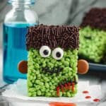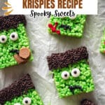 These Halloween Rice Krispies Treats are fun, festive, and perfect for a spooky celebration. Shaped like Frankenstein’s Monster, these bright green, chewy treats are coated with melted chocolate, decorated with candy eyeballs, and finished with playful icing details for a creepy-cute effect.