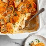 - Assemble Casserole: In a 9×13 inch oven-safe casserole dish, spread a thin layer of the red pepper cashew sauce to coat the bottom. Place a layer of sweet potato slices and some shallots on top, followed by another layer of sauce and a layer of cauliflower. Repeat layering until all ingredients are used, finishing with a layer of sauce on top.