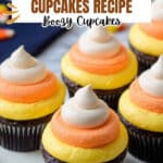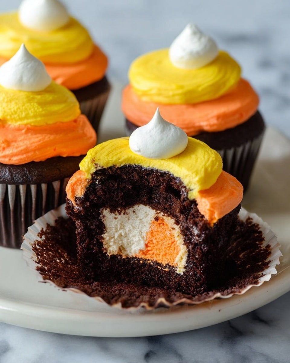 - Pipe Frosting: Fill piping bags with colored frostings. Pipe on cupcakes in circular layers starting with yellow, then orange, and finish with white to create a candy corn effect.