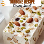 This traditional Italian Torrone recipe is a soft, chewy white nougat made with honey, sugar, egg whites, and toasted nuts. Perfectly sweet and nutty, Torrone is a delightful treat that can be enjoyed as a dessert or snack. The recipe guides you through toasting nuts, preparing honey and sugar syrups, whipping egg whites, and combining all ingredients to create a classic festive confection.