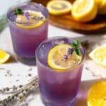 - Add color and serve: Optionally, add a couple drops of blue or purple food coloring to enhance the lemonade’s appearance. Serve the lavender lemonade over ice with lemon slices as garnish.
