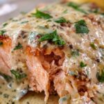 Delicious baked salmon fillets topped with a rich and creamy lemon butter garlic sauce, perfect for an elegant and easy dinner.