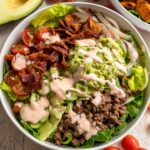 Grab your serving bowls and layer the chopped romaine lettuce on the bottom. Add a generous scoop of the crumbled beef right in the middle. Now for the fun part—surround it with cherry tomatoes, pickle chips, crumbled bacon, sautéed onions, and that luscious guacamole you mashed earlier. Finally, drizzle your special sauce on top, and if you’re like me, add extra spoonfuls on the side for dipping. Serve right away and enjoy those loaded flavors!