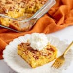- Perfect Texture Combo: The pumpkin custard base stays creamy while the cake mix bakes into a golden, crumbly topping with buttery pecans adding crunch.