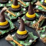 Melted Witch Halloween Bark is a festive and fun treat perfect for Halloween celebrations. This recipe features chocolate witch hats made from cookies and bugles, adorable witch brooms constructed with pretzel sticks and almond slivers, and a colorful chocolate bark base swirled with green candy melts, semi sweet, and milk chocolate. Decorated with candy eyeballs, this easy-to-make dessert is both spooky and delicious, ideal for parties or as a charming gift.