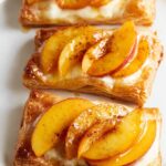 - Assemble Tarts: Place dough squares on a baking sheet. Fold up edges about 1/4 inch to create a wall. Place two cream cheese slices in the center, drizzle honey mixture over cheese, and arrange peach slices on top. Brush dough edges with heavy cream and sprinkle generously with cinnamon sugar. Drizzle more honey mixture over the assembled tarts.