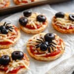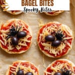 Mini Spider Pizza Bagel Bites are a fun and spooky snack featuring mini bagels topped with pizza sauce, vegan cheese, black olives arranged like spiders, and optional fresh basil and veggies. Perfect for Halloween or any playful gathering, these crispy little pizzas are baked to melty, savory perfection.