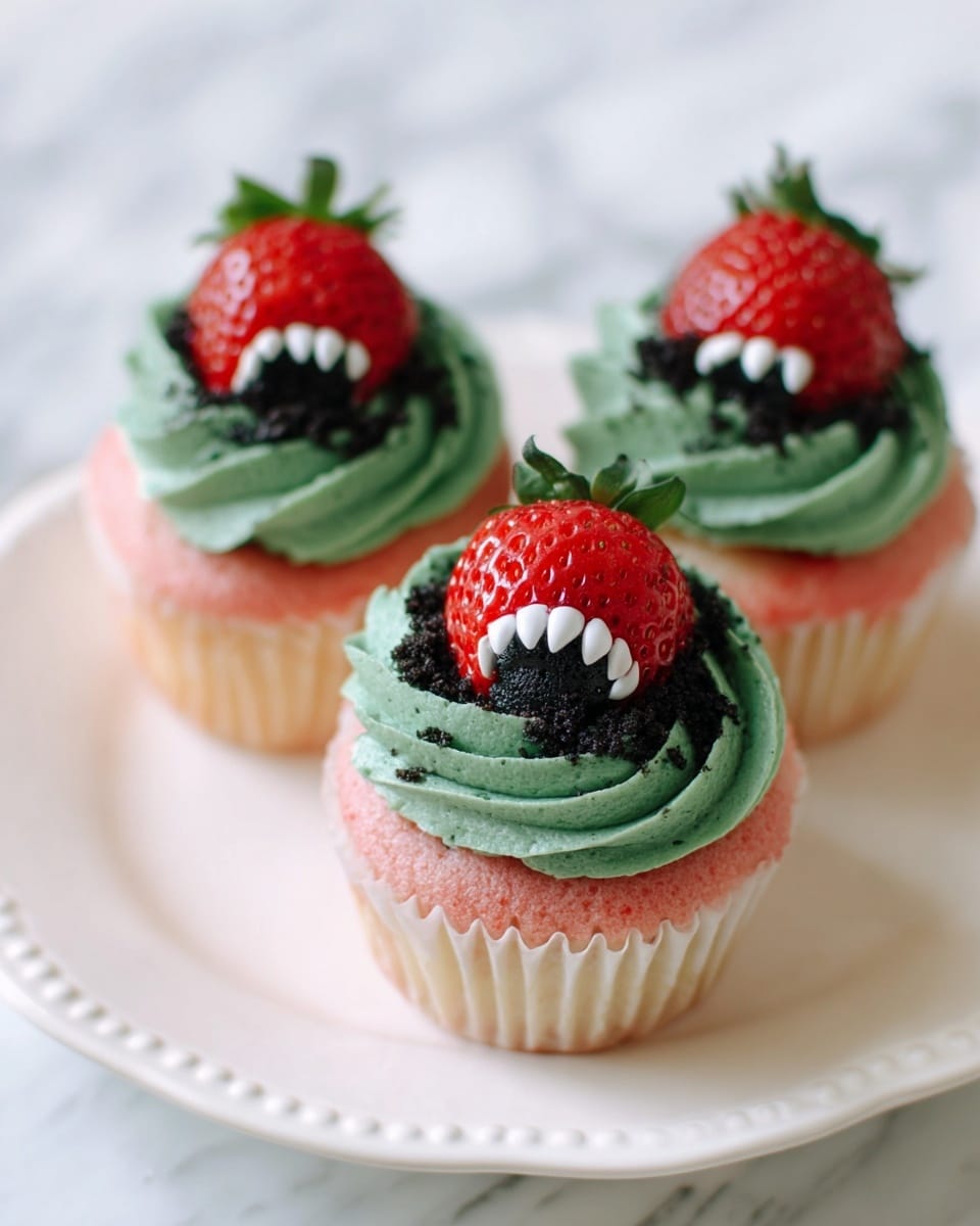 Here’s my favorite part: decorating! I top each cupcake with the green buttercream, then sprinkle Oreo crumbs on top for a little crunch and earthiness. Next, place a few monstrous “monster” strawberries – these are just fresh strawberries with whimsical cuts or googly candy eyes to make them look spooky and fun. They’re always a hit and make the cupcakes party-ready.